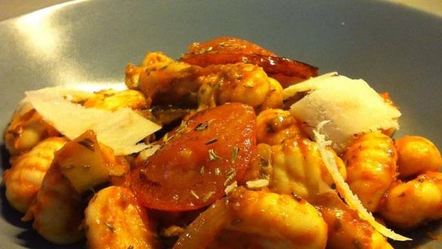 Faites chauffer dans une poêle de l'huile d'olive et faire frire la tomate avec du romarin parsemer sur le dessus en les retournant de temps en temps. Dresser vos gnocchi dans une assiette rajouter par dessus les tomates frites ainsi que les copeaux de parmesan.