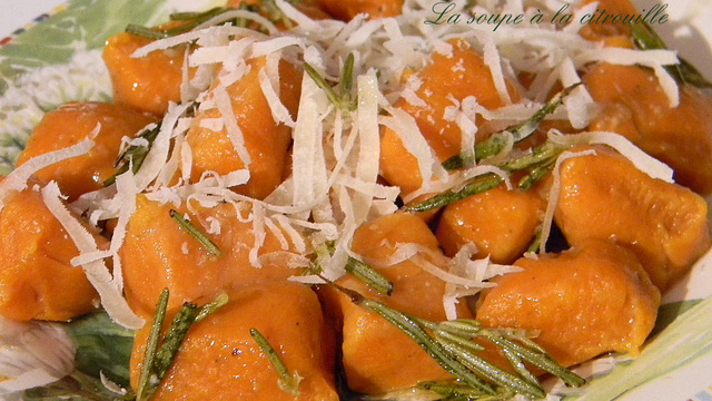 De délicieux gnocchi à la courge butternut servis avec un beurre au romarin et du parmesan; en hiver c'est du soleil dans votre assiette!