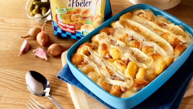 Voici la "gnocchiflette" une variante gourmande et originale de la tartiflette, réalisée avec des gnocchis à poêler à la place des pommes de terre.