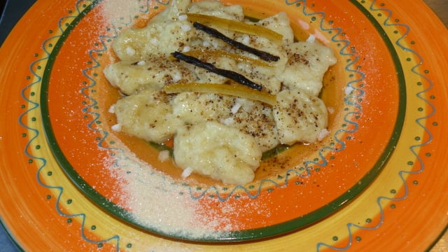 Faire fondre un bon morceau de beurre dans lequel on ajoute la gousse de vanille ouverte en deux. Égoutter les gnocchis les saupoudrer de sucre vanillé, les beurrer et saupoudrer de poudre d'amandes juste dorée. Servir chaud !