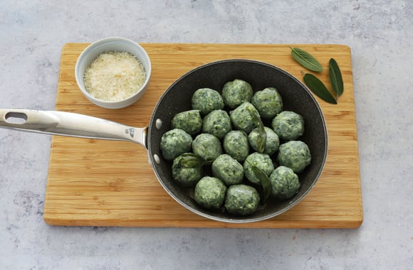 Sur un autre feu, portez à ébullition un grand volume d'eau dans une casserole haute. Dès l'ébullition, salez l'eau et plongez-y délicatement 5 boulettes. Dès qu'elles remontent à la surface de l'eau, récupérez-les avec une écumoire et déposez-les dans la poêle avec le beurre fondu à la sauge. Répétez l'opération afin de cuire toutes les boulettes, 5 à la fois. On ne les fait pas cuire toutes ensemble pour ne pas les casser.