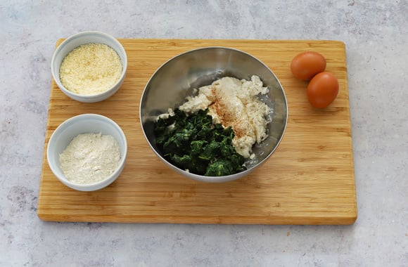 Versez la ricotta dans un saladier. Salez, poivrez, ajoutez la noix muscade, le parmesan râpé, les épinards, et les oeufs. Mélangez le tout à la fourchette, ajoutez la moitié de la farine et réservez le reste sur une assiette plate pour fariner les gnudi une fois formés.