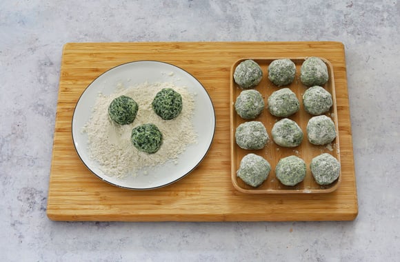 3Avec les mains humides, formez avec la farce des boulettes de la taille d'une grosse noix. Passez-les dans la farine, déposez-les sur une assiette ou sur une planche.