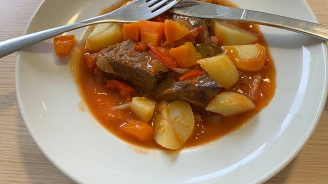 Servez la goulasch arrosé de crème fraiche et abondamment persillé.