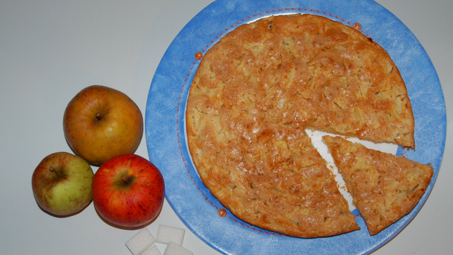 Gâteau aux pommes croquant au dessus et tendre dedans.