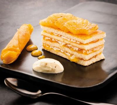 Découper le biscuit génoise en rectangle de 4 cm sur 2.5 cm. Etaler la confiture sur les rectangles. Les empiler pour obtenir un entremet de 8 cm de haut. Poêler 4 à 5 quartiers d'ananas et les déposer sur l'entremet. Garnir la cigarette croustillante avec le siphon passion. La poser sur les quartiers d'ananas. Accompagner le tout d'une quenelle de crème de mascarpone. Servir.