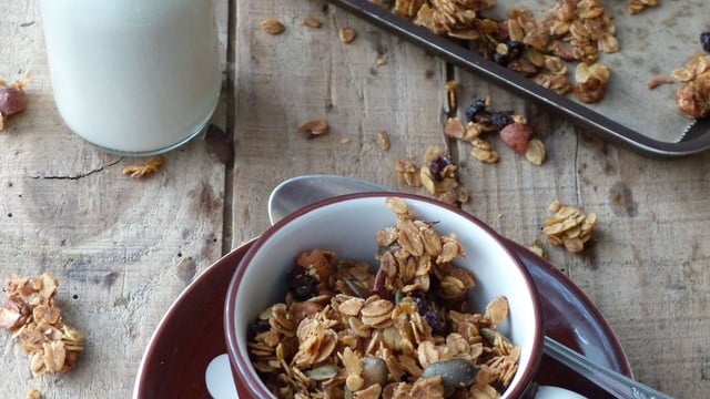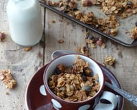 Laissez refroidir sur la plaque. Puis, versez le granola dans un bocal hermétique. Il se conservera 3 à 4 jours.