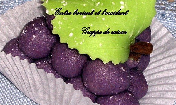 Prélever une petite part que vous colorez en vert pour les feuilles et le reste en violet. Commencer par confectionner des boulettes de la taille d'une noisette et les réserver. Former la base de la grappe qui sévira de point de départ à partir de 5 boulettes bien serrées. A l'arrière de ces 5 boulettes et entre l'une et l'autre placer 4 boulettes, puis 3 boulettes, 2 boulettes et finir la base par 1 boulette.