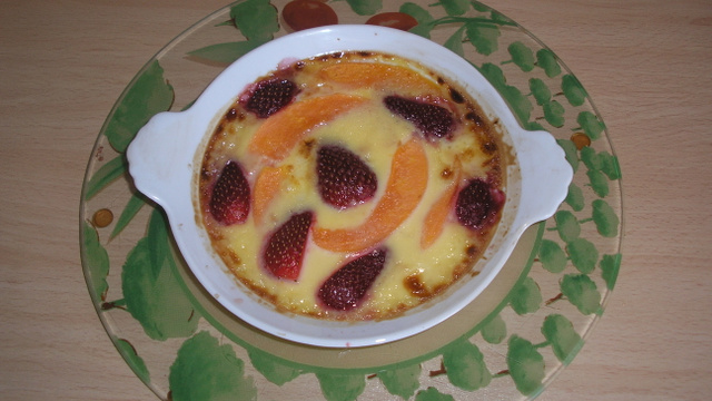 Tapisser les fonds de petits moules ou petites cassolettes beurré(e)s allant au four avec les fruits.