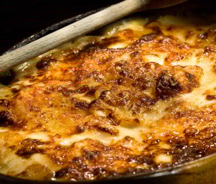 - 4Disposer les pommes de terre dans un plat à gratin légèrement beurré, mettre un peu de la crème de cuisson, ajouter les lamelles de Comté entre les rondelles, puis le Comté râpé au final. Enfourner 30 min et servir bien chaud.