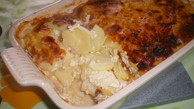 Coupez les pommes de terre en rondelles et étalez les dans un moule à gratin beurré.