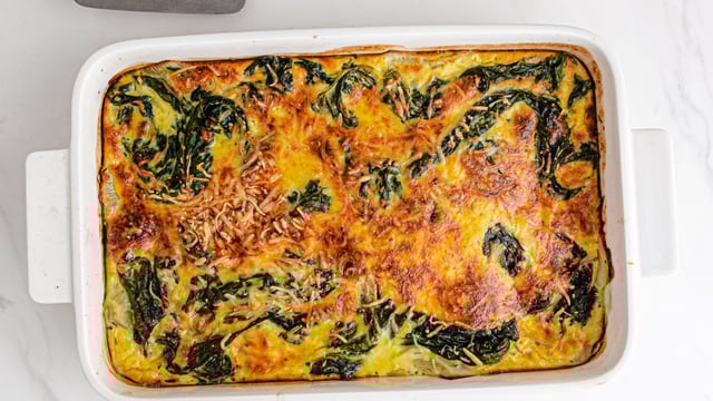 Versez le tout dans un plat à gratin beurré. enfournez et faites cuire le gratin 50 à 55 minutes. Laissez légèrement tiédir le gratin avant de le déguster.