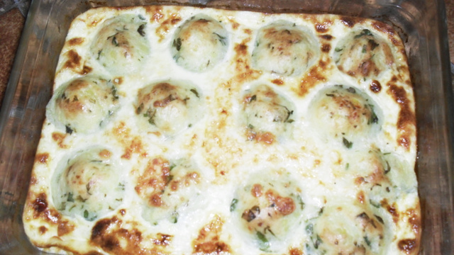 Façonner des boulettes et les disposer dans un moule.(mon moule était petit (20 cm /15) , si vous voulez un plus grand gratin je vous conseille de doubler les quantités )