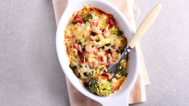 - 2Egoutter les brocolis et les disposer dans le plat.Ajouter le jambon coupé en petits dés.Assaisonnez et verser la crème dessus.Saupoudrer de gruyère.