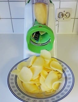 1Éplucher les pommes de terre et les couper en fines tranches grâce au robot multifonction. Les cuire dans une eau bouillante salée pendant 5 à 10min. Faire de même avec le céleri rave.