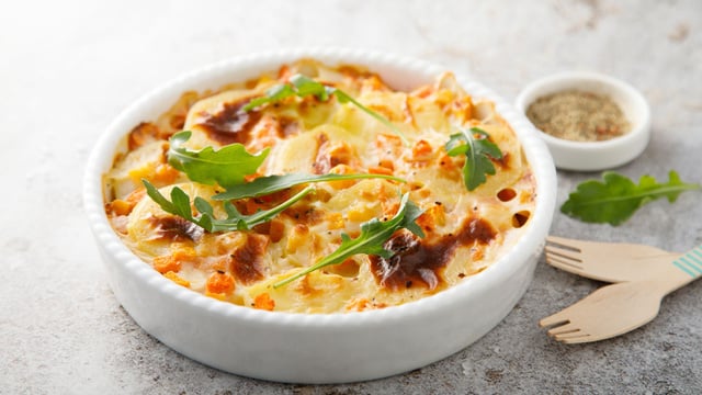 2Dans un plat à gratin beurré, disposer des couches de pommes de terre, de céleri rave, de lardons. Dans un poêlon, faire fondre le gorgonzola avec la crème et le lait de coco. Verser cette crème sur les légumes.
