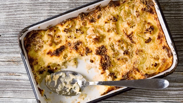 Versez le mélange aux œufs et à la crème dans le plat à gratin et parsemez avec le restant du parmesan. Enfournez à 190°C pour une trentaine de minute, jusqu'à ce que le gratin soit doré et la garniture prise.