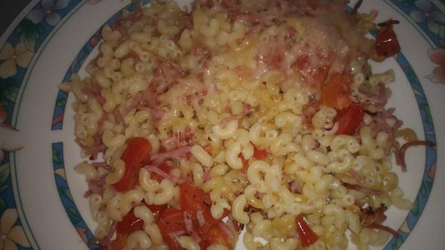 Ajoutez les tomates et le jambon avec les coquillettes. Bien mélanger.Puis recouvrir avec les 75g d'emmental rapé.
