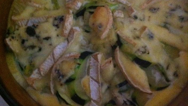 Disposez vos courgettes en rosace dans un plat allant au four. Epluchez, coupez en rondelles les oignons, placez les sur votre rosace de courgettes. Déposez en rosace des lamelles de bleus.