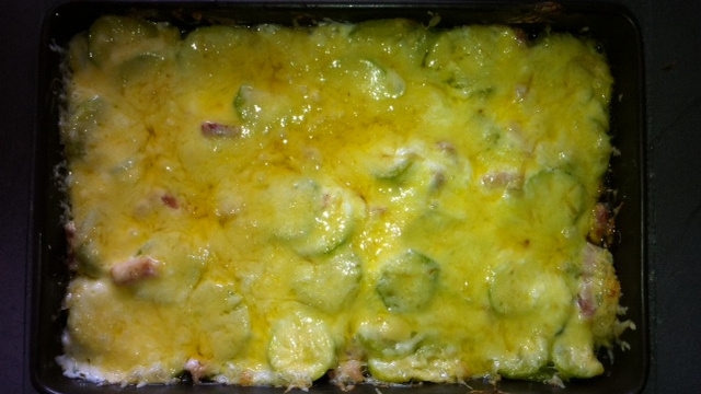Epluchez et coupez en lamelles assez fine vos courgettes. Faites les cuires a feu doux puis les passer dans un egouttoir afin de retirer l'eau rendu durant la cuisson puis réservez les. Ensuite faire cuire les lardons,mélangez vos courgettes salez et poivrez,laissez 5mn sur feu doux.Dans un plat a gratin versez l'ensemble,par dessus votre creme epaisse et parsemez avec votre gruyere et au four environ 10mn pour faire gratiner le fromage.