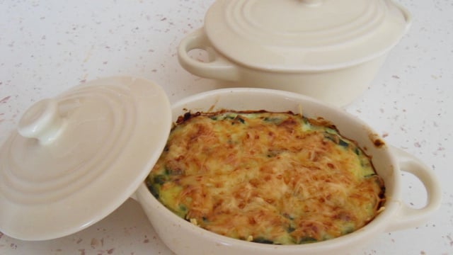 Mettre les courgettes en couche dans un plat à gratin allant au four et verser la préparation oeufs crème sur les courgettes.