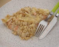 Les égoutter et les mélanger au mélange endives-oignon. Ajouter les dés de saumon, saler et poivrer.