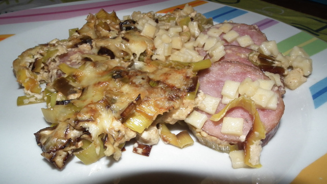 Beurrez le fond d'un plat à gratin, versez les crozets, puis les poireaux à la crème et les rondelles de saucisse.