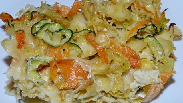 Faire cuire les Farfalle al denté, dans une marmite remplie d'eau salée. Égoutter. Laver les légumes, éplucher les carottes puis les couper en tagliatelles. Dans une poêle avec un peu d'huile d'olive, faire revenir l'oignon émincé.