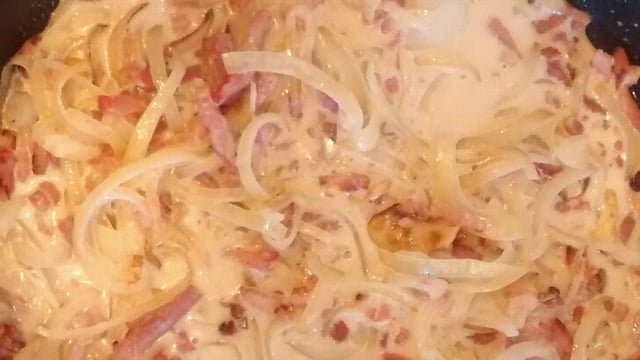 - 1Emincer les oignons et les faire cuire dans une poêle avec les lardons, une fois l'ensemble cuit, ajoutez la crème fraîche.