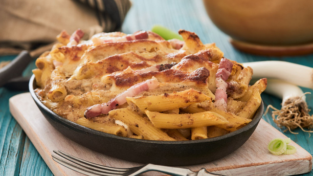 Égouttez les pâtes et les mettre dans un plat à gratin.