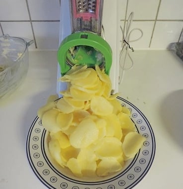 1Peler les pommes de terre et les couper en fines tranches au robot ou à la mandoline.