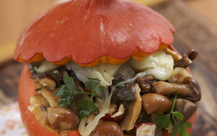 Sortir les potirons du four (après environ 10 mn), les remplir de préparation au canard puis de mélange aux champignons. Répartir la tome râpée, les noisettes grossièrement concassés et couvrir de parcelles de beurre. Faire cuire au milieu du four pendant 20 mn. Mettre les chapeaux à réchauffer 5 mn avant la fin de cuisson.