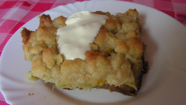 Des biscottes, de la rhubarbe par dessus et ensuite du steusel, juste de quoi se régaler.