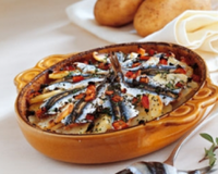 Préchauffez le four à 180 °C (th. 4). Superposez dans le plat 1 couche de pommes de terre en rondelles, les filets de 4 sardines, dés de tomate, 2 brins de persil ciselés fin, recommencez 2 fois.