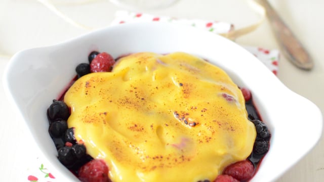 Napper de sabayon, dorez avec un chalumeau à crème brûlée ou passer environ 1 min 30, sous le gril du four très chaud.