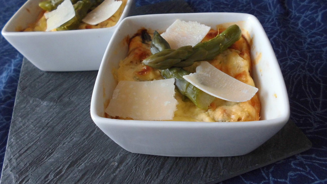 A la sortie du four, décorez chaque gratin avec deux pointes d'asperges et quelques copeaux de parmesan. Dégustez en entrée ou en accompagnement d'une viande.