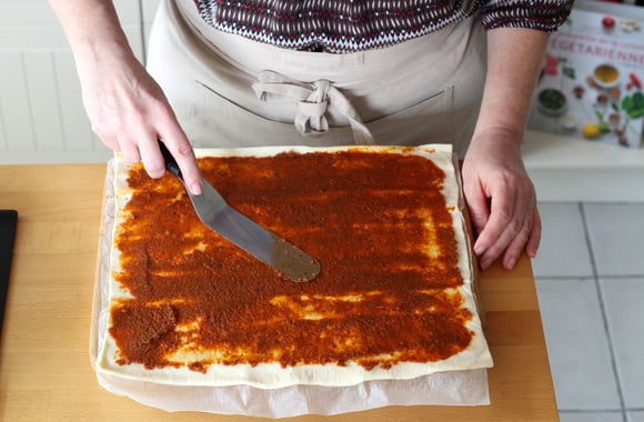 1Étalez la purée de tomates séchées sur la pâte à pizza.
