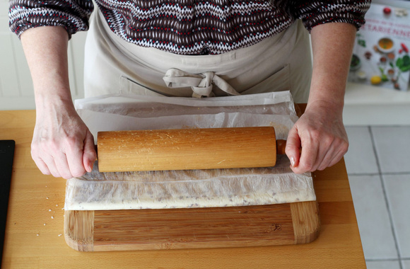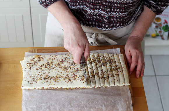 4Donnez un coup de rouleau pour aplatir la pâte pliée en deux, retournez la pâte, parsemez de graines puis redonnez un coup de rouleau.