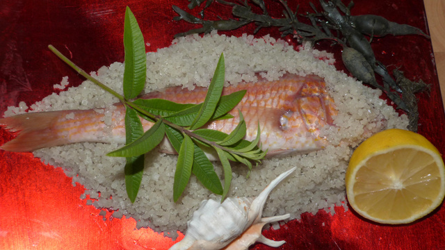 A la sortie du four, laissez reposer 5 minutes et présentez le poisson dans sa croûte de sel au centre de la table... Les 6 convives cassent ensemble la coque de sel avec le dos d'une cuillère : toutes les odeurs emprisonnées s'exhalent en chatouillant délicieusement leurs narines. Après avoir écarté les algues et la peau orangée du grondin perlon, ilsse servent une belle portion de chair savoureuse et fondante qu'ils arrosent de sauce citronnée à la verveine:un vrai délice light à savourer sans modération avec un petit verre de vin blanc sec bien frais...