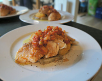 Grondin cuit au four avec des oignons grelots,tomates epicé avec canelle gingembre et safran.