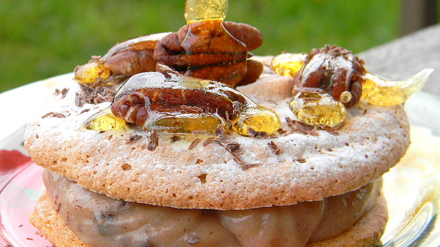 Posez un macaron à l'envers dans 6 assiettes. Recouvrez de crème de marron, puis d'un deuxième macaron face bombée au-dessus. Décorez avec les noix caramélisées et servez aussitôt.