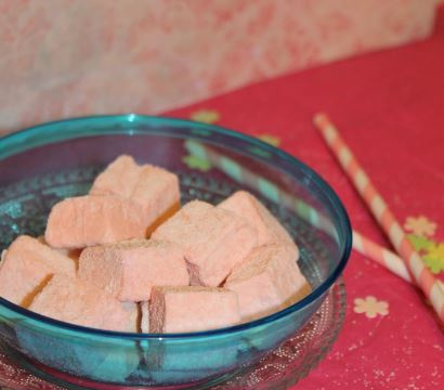 Lorsque la guimauve est prise, saupoudrez le plan de travail de sucre glace avant de démouler. A l'aide d'un couteau à lame lisse, découpez des carrés de guimauve. J'ai ensuite rempli un plat de sucre glace et posé les carrés de guimauve dedans. Faites-les rouler pour les enrober complètement !
