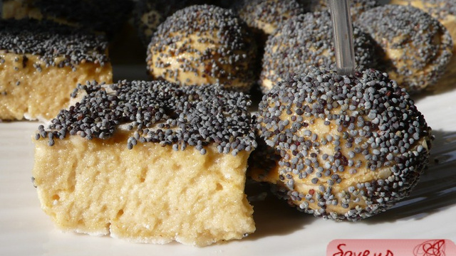 Démouler, former les sphères ou découper en carrés et rouler partiellement ou entièrement dans les graines de pavot.