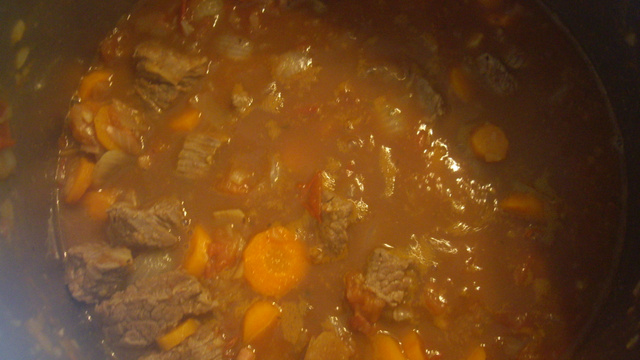 Ajouter le bœuf coupé en dés, les carottes en rondelles, les tomates en quartiers.
