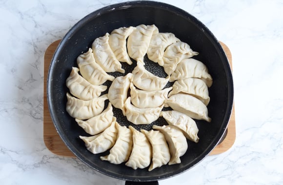 Ajoutez 20 cl d'eau sur les gyoza. Couvrez la poêle avec un couvercle et laissez les gyoza cuire pendant 10 minutes.