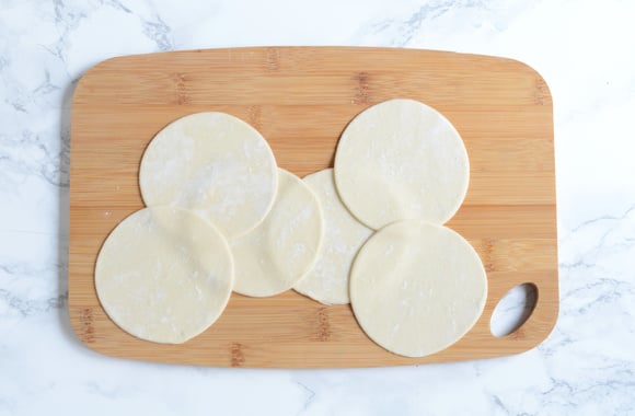 Saupoudrez la pâte étalée de fécule de maïs des deux côtés puis à l'aide d'un emporte-pièce rond de 9 cm de diamètre, découpez des cercles de pâte.