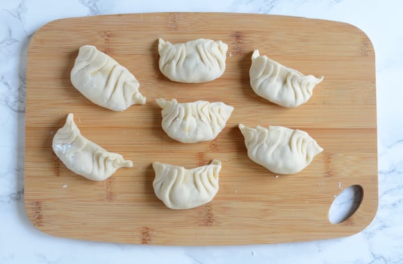 6Tout en pinçant la pâte latéralement pour faire les plis caractéristiques des gyoza.