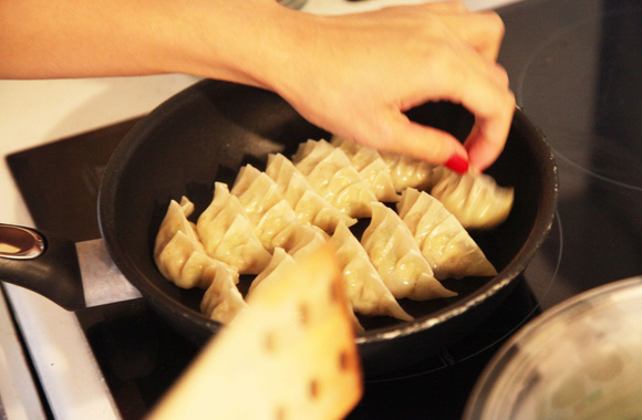 Dans une poêle, faites frémir 1 grande cuillère à soupe d'huile de soja ou d'huile végétale et déposez-y délicatement les gyozas. Faites-les brunir d'un côté, puis de l'autre. Ajoutez ensuite 1/2 verre d'eau dans la poêle et couvrez. Quand l'eau est évaporée, la cuisson est finie.