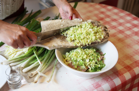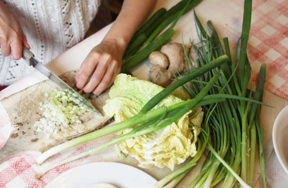 1Emincez la ciboulette, les feuilles de chou et le gingembre.