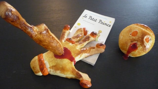 J'ai imaginé une main de sorcière qui voudrait me chiper mon livre fétiche... celui du Petit Prince ! Vous imaginez le drame ! Il a donc fallu sévir ! Regardez plutôt ...En ce qui concerne la pâte à brioche, vous verrez que je n'ai utilisé que très peu d'ingrédients et que celle-ci est délicieuse, avant cuisson la pâte est très malléable, une vraie pâte à modeler !